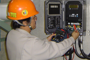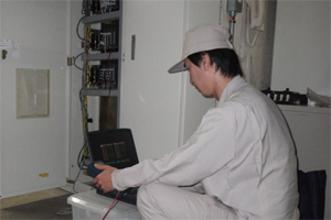 この写真は電気設備の運用監視を行っているコントローラを点検しているところです。