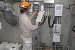 浄水場にて浄水の水質を計測する水質計を点検しているところです。