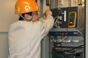 この写真は電気設備の運用監視を行っているコントローラを点検しているところです。